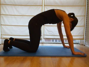9.Elevación de rodillas en cuadrupedia: Manteniendo la postura neutra de la espalda, inspiramos y al exhalar elevamos las rodillas del suelo. Intentamos mantener la postura entre 2 o 3 respiraciones. Repetimos 3 veces.
