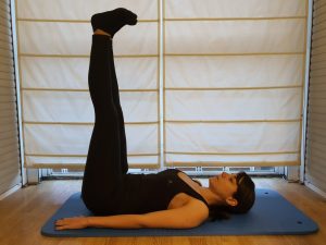 6.Posición del 100: En posición neutra, al exhalar llevamos el pubis hacia la nariz manteniendo la lumbar completamente apoyada en la colchoneta. Inspiramos y durante las exhalaciones una a una levantamos nuestras piernas en una flexión de cadera y rodillas de 90º. Inspiramos en la posición del 100 y al exhalar extendemos las piernas hacia el techo sin permitir que al abdomen “se escape hacia fuera”. Inspirando volvemos a doblar las rodillas a 90º. 5 repeticiones.