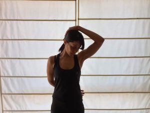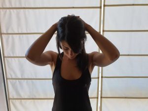 - Ponemos las manos detrás del cráneo realizando una flexión cervical (si perder la posición recta de la región dorsal) y hacemos una ligera tracción hacia delante notando el estiramiento en la parte posterior del cuello. Mantenemos un minuto.