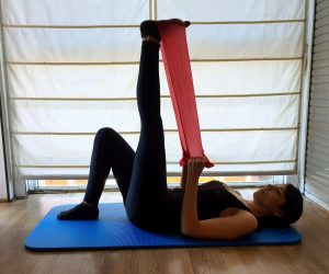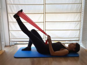 5.Estiramiento de isquiotibiales. Manteniendo la posición del ejercicio anterior, sujetamos la planta del pie con una cinta (sin dejar que la lumbar se apoye en la colchoneta) y llevamos la pierna hacia el techo hasta notar un estiramiento en la parte poster. Mantenemos el estiramiento entre 30 segundo a 1 minuto.
